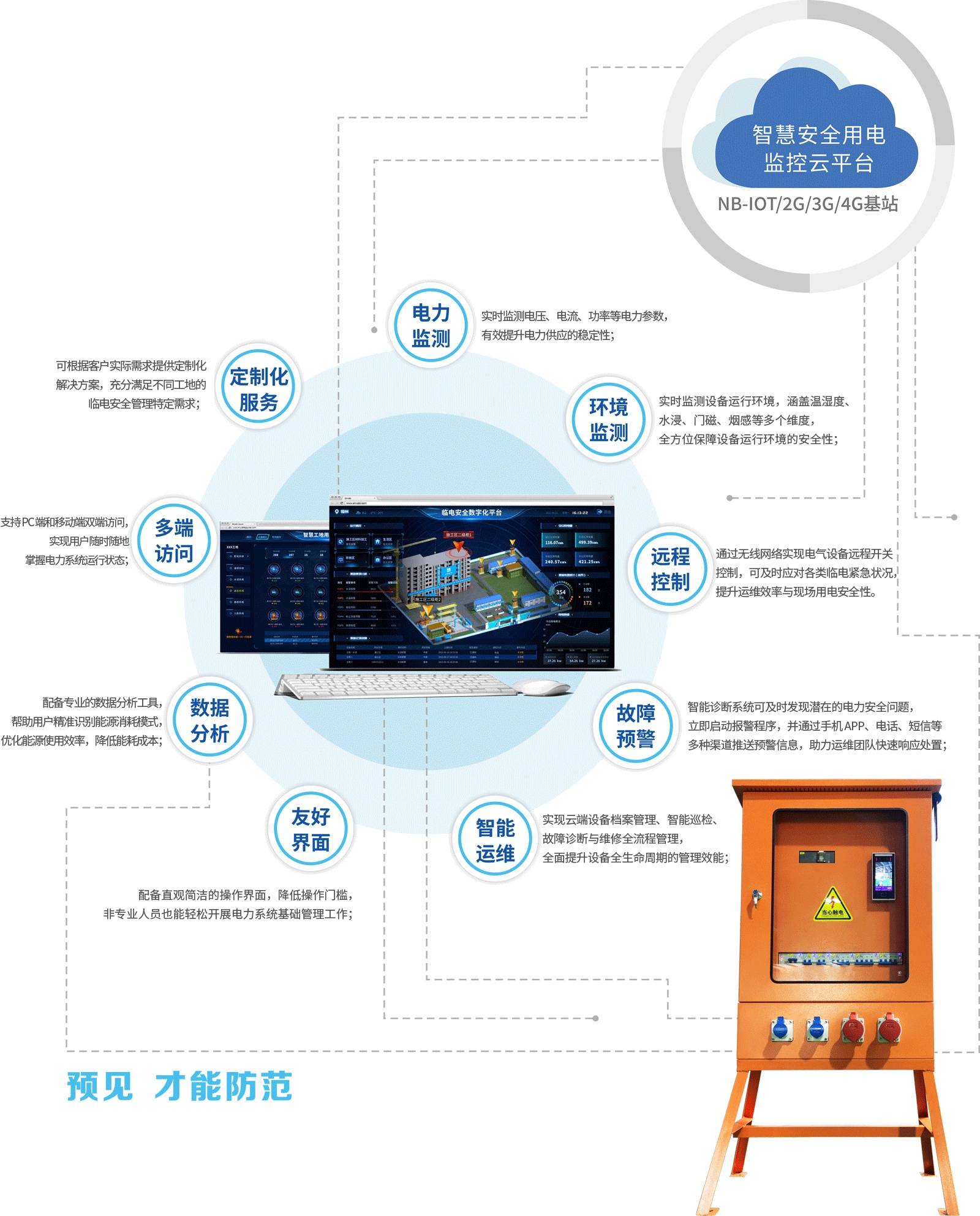臨電安全數(shù)字化平臺系統(tǒng)由智能斷路器、溫濕度傳感器、煙霧傳感器、水浸傳感器、傾角傳感器、人臉識別設備、監(jiān)測主機組成,深度融合物聯(lián)網(wǎng)技術,通過對電氣設備各類運行數(shù)據(jù)進行實時監(jiān)測、不間斷 AI 大數(shù)據(jù)分析,依托自主研發(fā)的安全智能數(shù)字中臺主機及多位一體動力柜,將檢測到的用電安全隱患信息及時預警,實現(xiàn)對用電線路、設備的全維度實時監(jiān)控,構建起全面覆蓋的臨電安全監(jiān)測體系,提升用電安全管理的精準性與高效性,最大程度防范電氣安全事故的發(fā)生,以技防為主、人防為輔,大幅提升臨電安全管理的智能化與高效性。