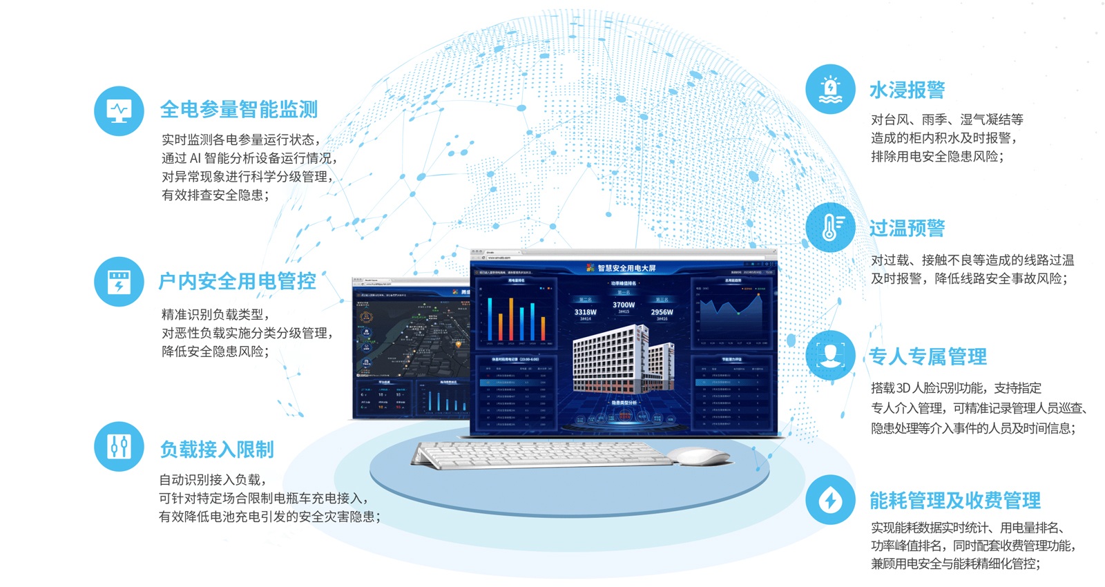 “數(shù)智安全用電” 是針對電氣防災研發(fā)的專業(yè)用電安全管理系統(tǒng),可對電氣線路末端負載中易引發(fā)安全事故的關(guān)鍵因素,進行不間斷數(shù)據(jù)監(jiān)測與分析,將檢測到的用電安全隱患信息及時預警并推送至相關(guān)負責人員,實現(xiàn)用電線路的實時監(jiān)控與提前預警,最大程度防范電氣安全事故發(fā)生。同時系統(tǒng)可提供電力數(shù)據(jù)化分析服務(wù),通過電力數(shù)據(jù)優(yōu)化用電效率,提升用電的穩(wěn)定性與節(jié)能性。